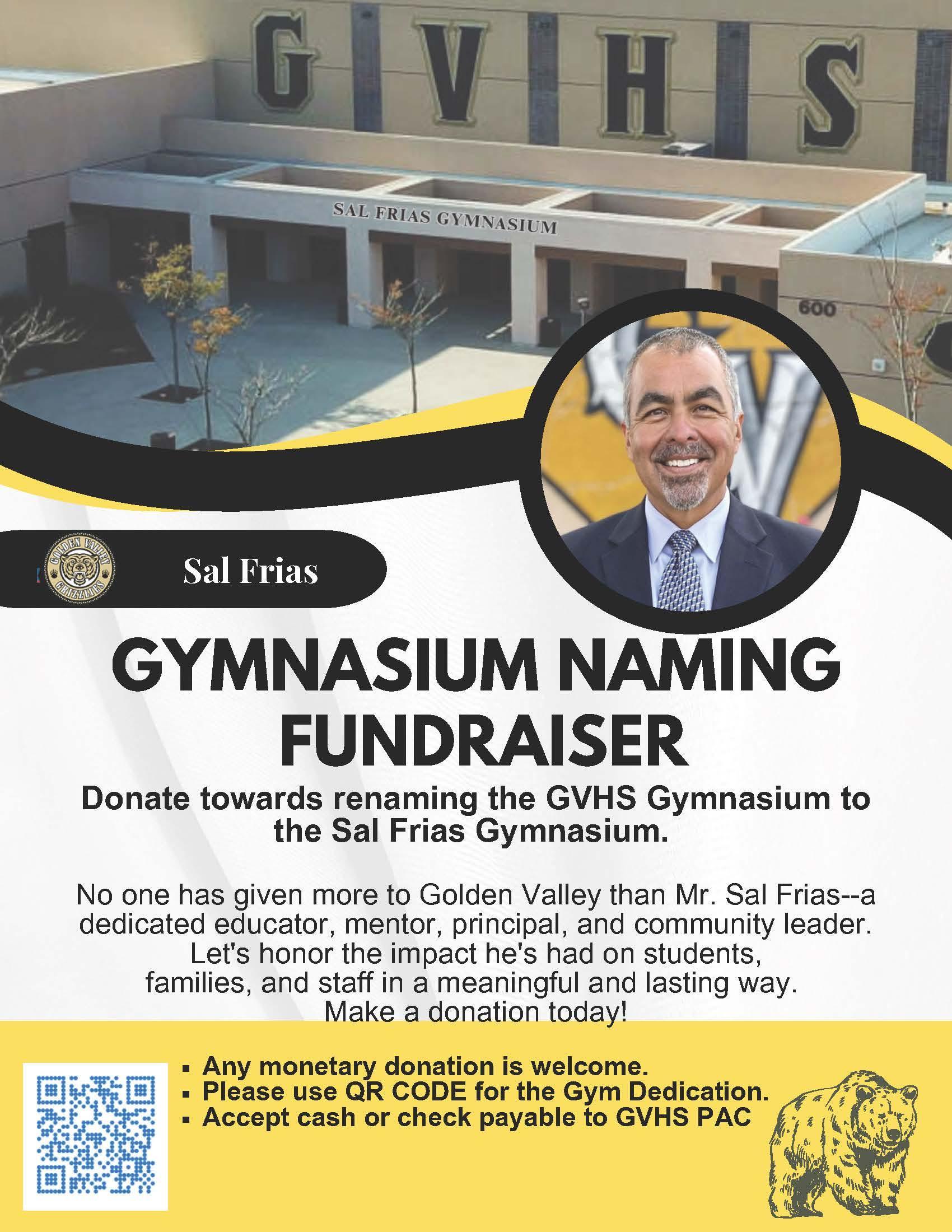 GYMNASIUM NAMING FUNDRAISER No one has given more to Golden Valley than Mr. Sal Frias--a dedicated educator, mentor, principal, and community leader. Let's honor the impact he's had on students, families, and staff in a meaningful and lasting way. Make a donation today! Print